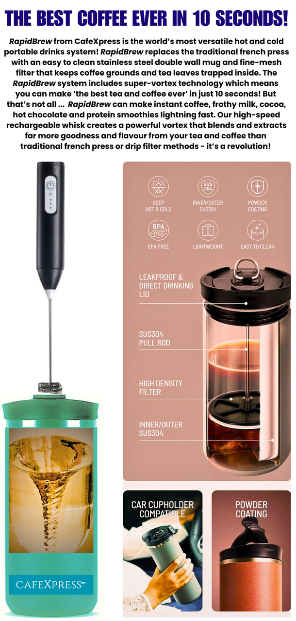 Loading... Please wait...Everything you need to make the 'best ever' tea and coffee in just 10 seconds! You receive our three speed, rechargeable super-whisk and 600 ml capacity double wall stainless steel portable french press to make, store and serve the hot or cold beverage of your choice!