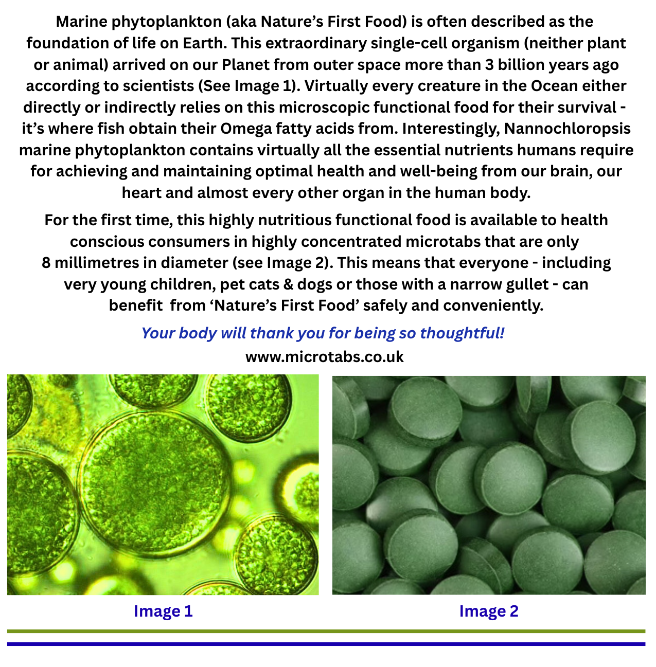 Nannochloropsis micro-algae (often described as Nature's First Food) is nutrient dense and vegan compatible containing complete protein, Omega-3, 6, 7 & 9 fatty acids plus vitamins, minerals, Xanthins, Chlorophyll and powerful anti-oxidants. These raw, enzyme-active functional food micro-tabs are especially suitable for very young children and those with a small or restricted gullet. For pets we suggest adding them to the food bowl or alternatively taken by mouth followed by plenty of water. These convenient size micro-tabs are just 8 millimetres in diameter so they are easy to swallow.